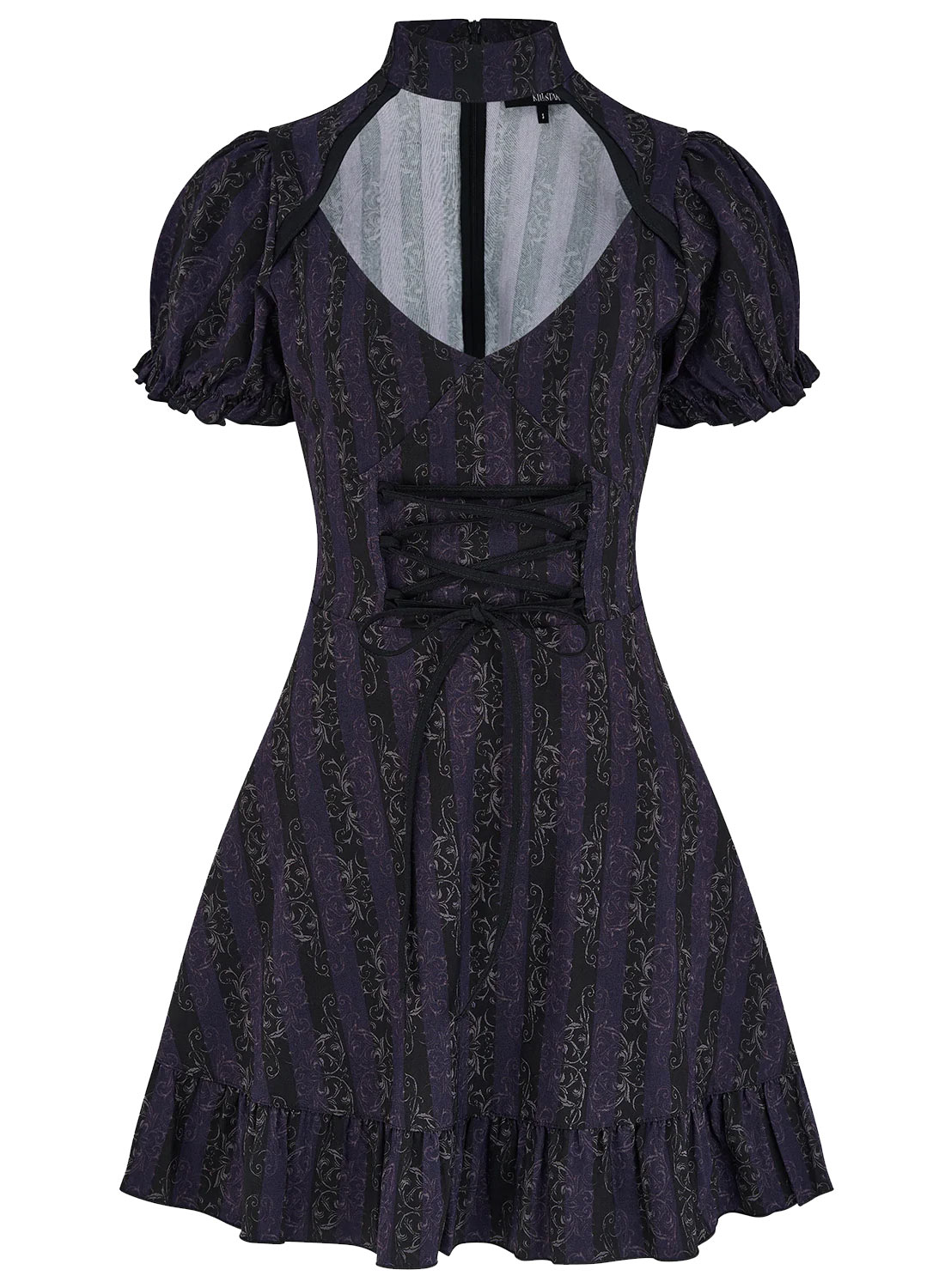 Denna gotiska klänning i svart och mörklila kombinerar romantiska detaljer med en modern alternativ estetik. Klänningen har ett elegant randigt mönster med subtila ornament, vilket ger ett lyxigt och vintageinspirerat uttryck.