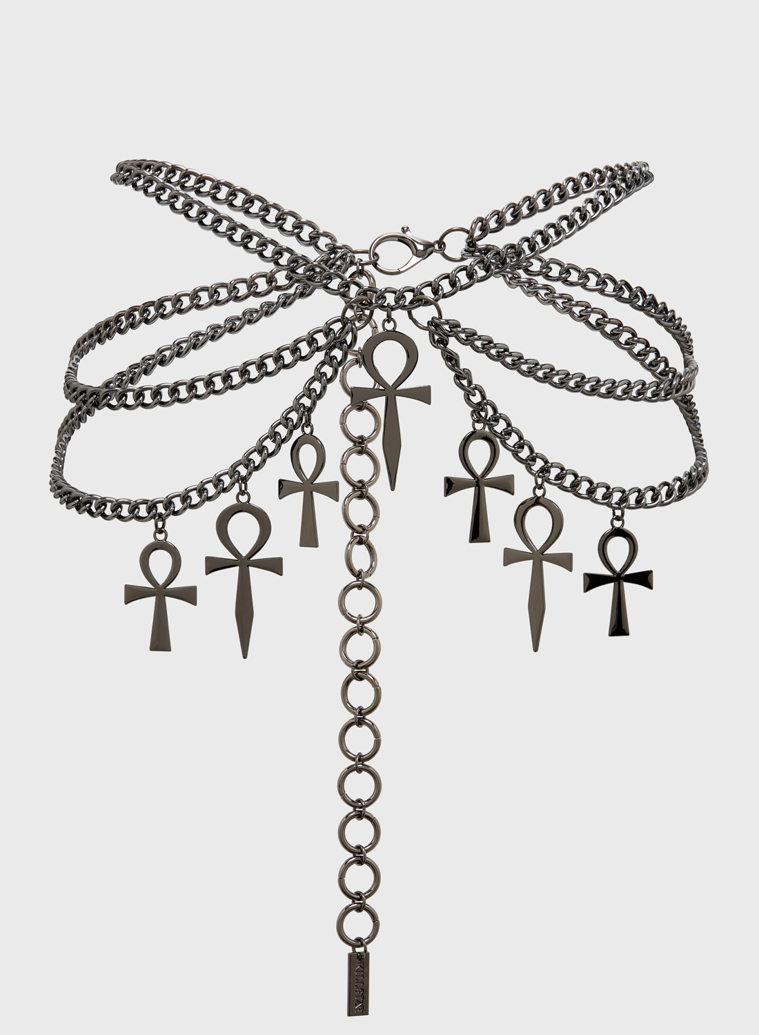 Detta statement-bälte består av flera lager metallkedjor som skapar en dynamisk siluett runt midjan eller höfterna. De ikoniska ankh-symbolerna – en symbol för liv och mystik – hänger dekorativt från kedjorna och ger bältet en distinkt och spirituell känsla.