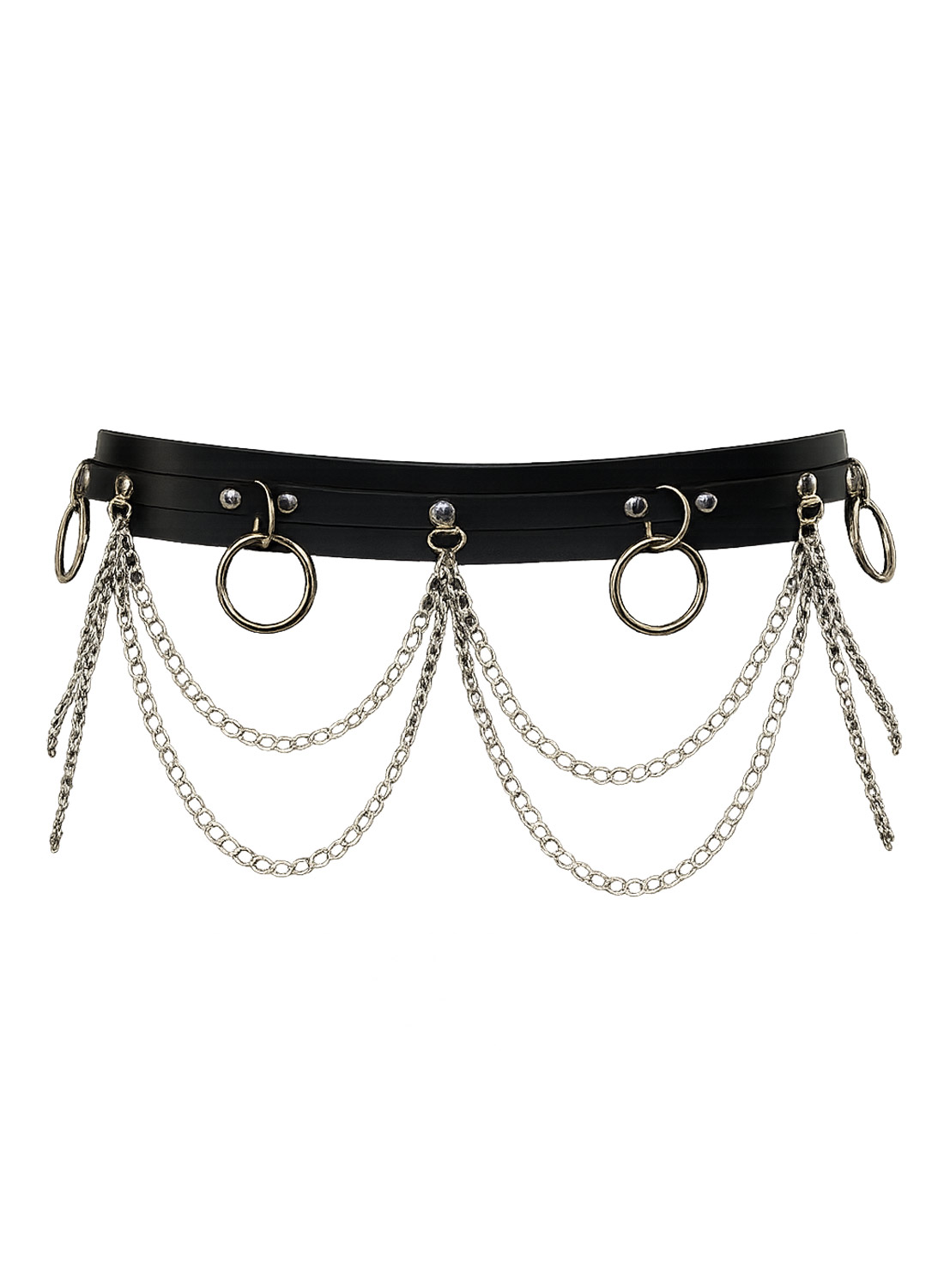 De draperade kedjorna skapar en snygg lager-effekt som ger rörelse och visuellt djup till bältet. Den här typen av accessoar har länge varit en viktig del av den alternativa modescenen och syns ofta inom både punk- och rockkulturen. Vill du läsa mer om stilen kan du exempelvis läsa om punkmodets historia på Wikipedia (extern inspirationskälla).