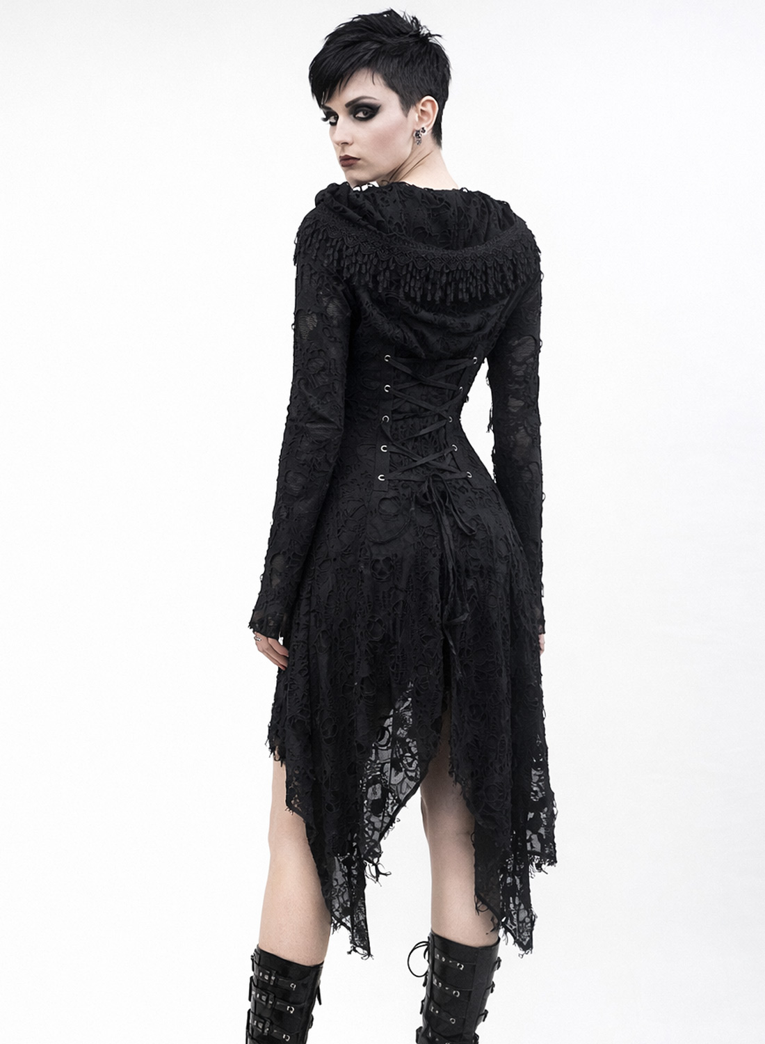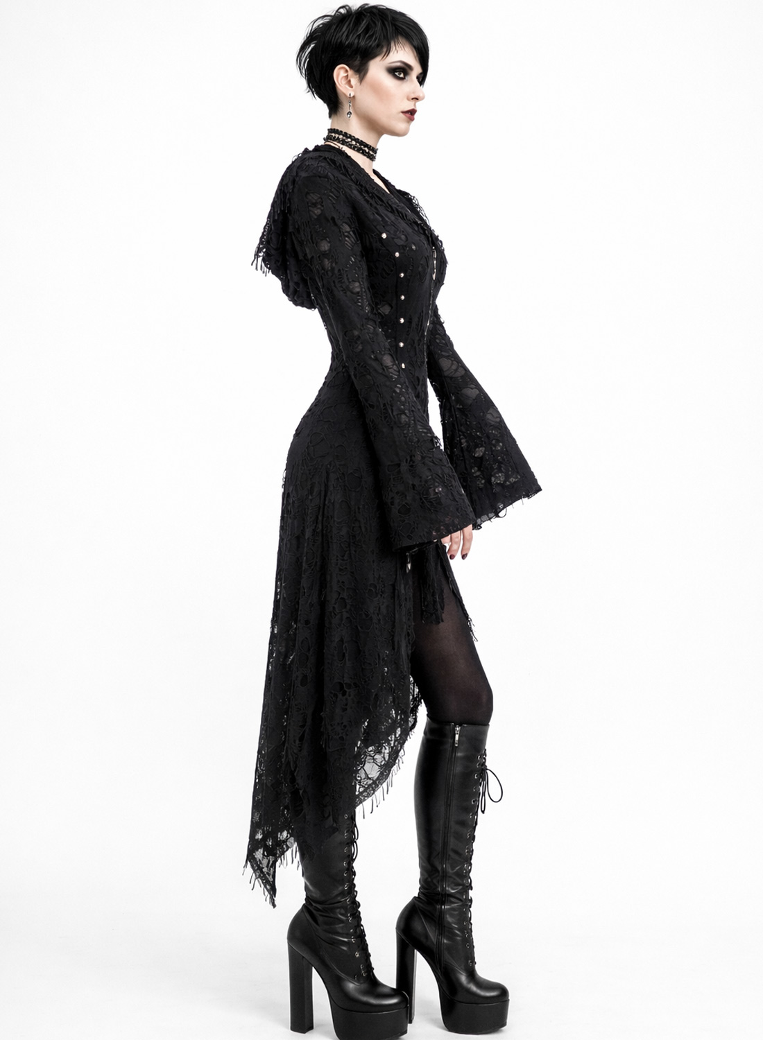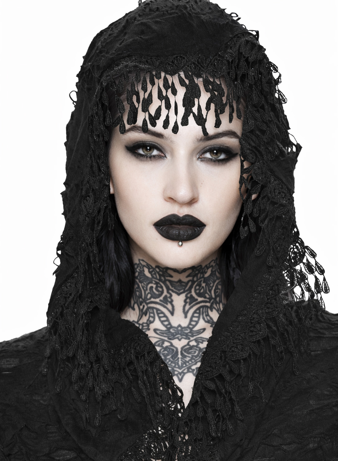 Denna gotiska luvtröja är en dramatisk och elegant svart gothic hoodie som kombinerar mörk romantik med modern alternativ stil. Tillverkad i strukturerat, rivet tyg med spetsdetaljer och råa asymmetriska kanter skapar designen ett kraftfullt och mystiskt uttryck. Den figurnära passformen tillsammans med korsettinspirerad snörning i ryggen framhäver silhuetten och ger en feminin men edgy look.