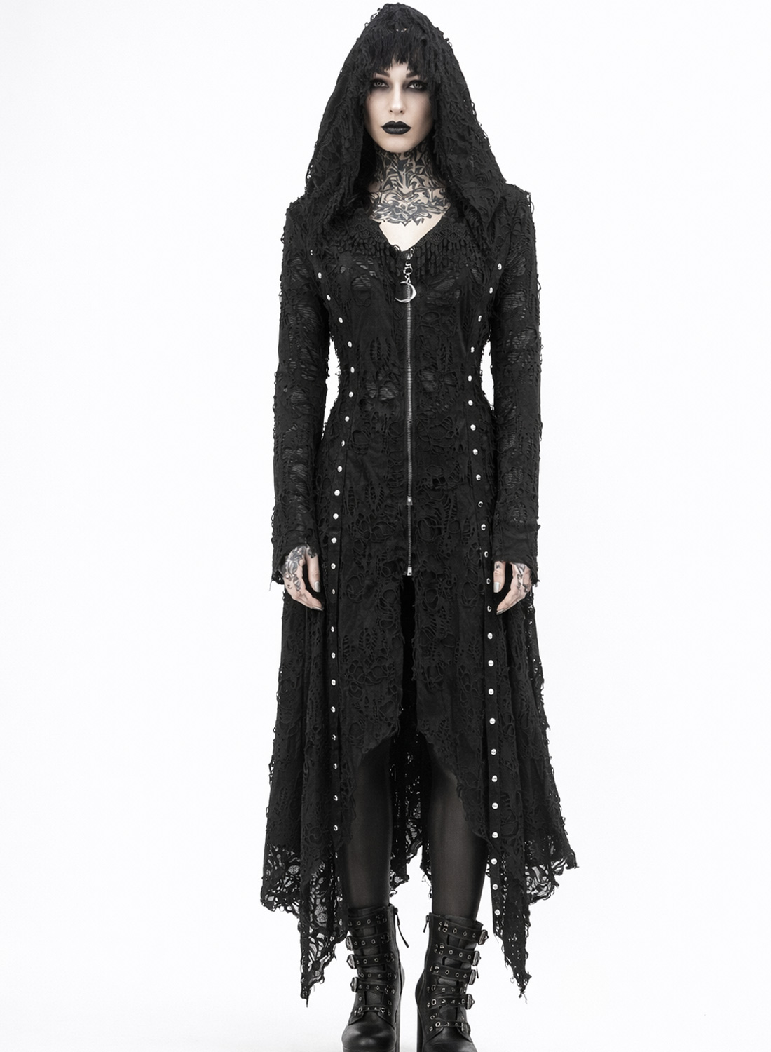 Tröjan har en dragkedja med månformat hänge, utsvängda ärmar och en djup, överdimensionerad huva som förstärker den dramatiska goth-estetiken. Perfekt för dig som älskar alternativt mode, dark fashion, witchy style och viktorianskt inspirerade plagg.