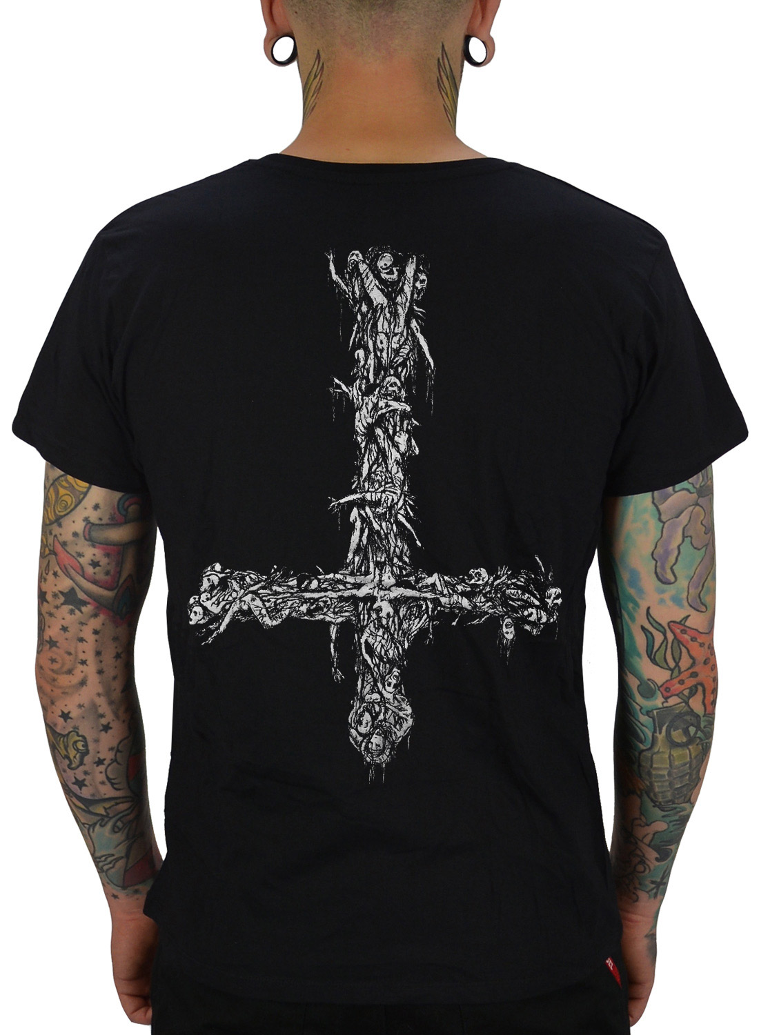 På baksidan finns ett stort, omvänt kors uppbyggt av förvridna kroppar och mörka detaljer. Detta skapar en kraftfull visuell effekt som förstärker tröjans ockulta tema. Samtidigt ger den genomarbetade designen en tydlig balans mellan fram- och baksida.